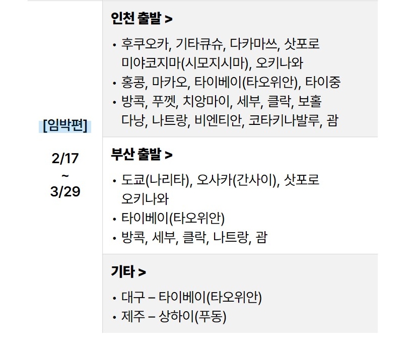 임박편 특가항공권 노선 (탑승 기간: 2/17~3/29)
