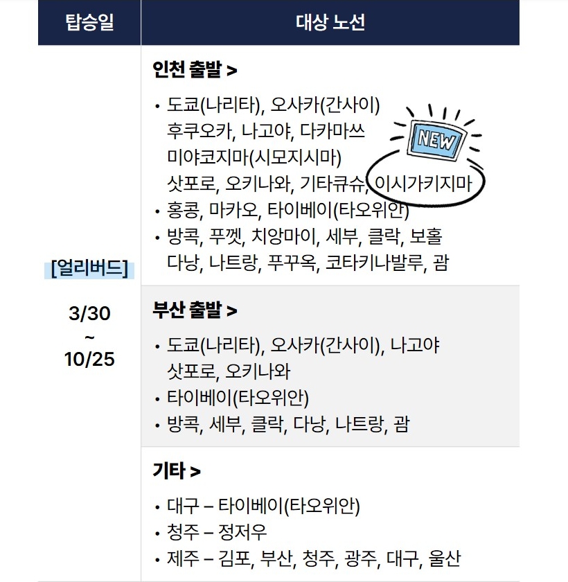 얼리버드 특가항공권 노선 (탑승 기간: 3/30~10/25)